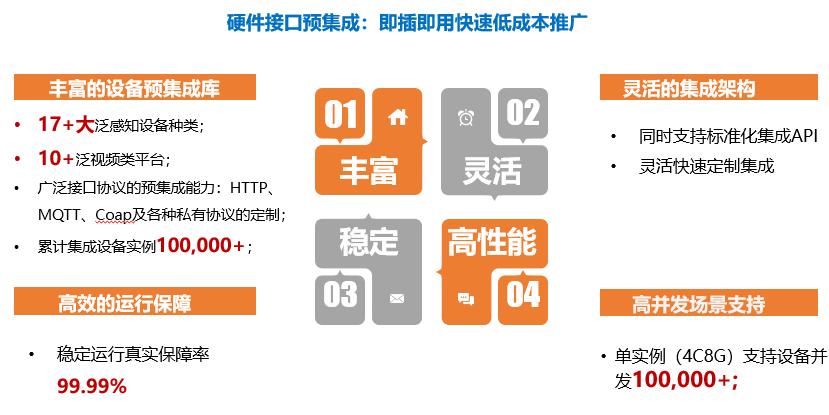迄今zoty中欧体育官方网站公司已經(jīng)預(yù)集成17+大泛感知設(shè)備種類,10+泛視頻類平臺(tái),廣泛接口協(xié)議的預(yù)集成能力涵蓋了HTTP、MQTT、Coap及各種私有協(xié)議的定制,累計(jì)集成設(shè)備實(shí)例達(dá)100,000+。它還支持標(biāo)準(zhǔn)化集成API,可靈活快速地定制集成,通過構(gòu)建規(guī)則引擎,實(shí)現(xiàn)了各設(shè)備間的聯(lián)動(dòng)應(yīng)用,比如檢測到違規(guī)停車,聯(lián)動(dòng)廣播就會(huì)自動(dòng)播報(bào)提醒,為社區(qū)管理服務(wù)賦能。