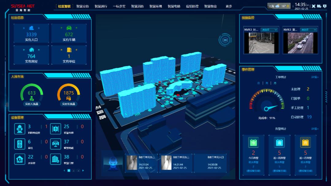 社區(qū)應(yīng)用平臺(tái)結(jié)合底層AIOT的物聯(lián)能力,將人、車、物的數(shù)據(jù)進(jìn)行融合分析應(yīng)用,實(shí)現(xiàn)了人-設(shè)備-事件實(shí)時(shí)感知,動(dòng)態(tài)聯(lián)動(dòng),在該平臺(tái)上可以全面直觀地展示小區(qū)人、車、物、房的運(yùn)行狀態(tài),為小區(qū)閉環(huán)管理、社區(qū)綜合治理和公安執(zhí)法監(jiān)督提供高效、準(zhǔn)確、及時(shí)的有力支持。比如通過二維/三維地圖,可以展示小區(qū)樓棟和智能設(shè)施的整體分布,以及小區(qū)房間和人員構(gòu)成,方便管理者掌握小區(qū)進(jìn)出人員和車輛,加強(qiáng)社區(qū)安全防控。再如打通了門禁、可視對(duì)講、停車、視頻監(jiān)控、電梯、物業(yè)管理等多個(gè)終端系統(tǒng),有助管理人員便捷操作,大大節(jié)約管理成本。